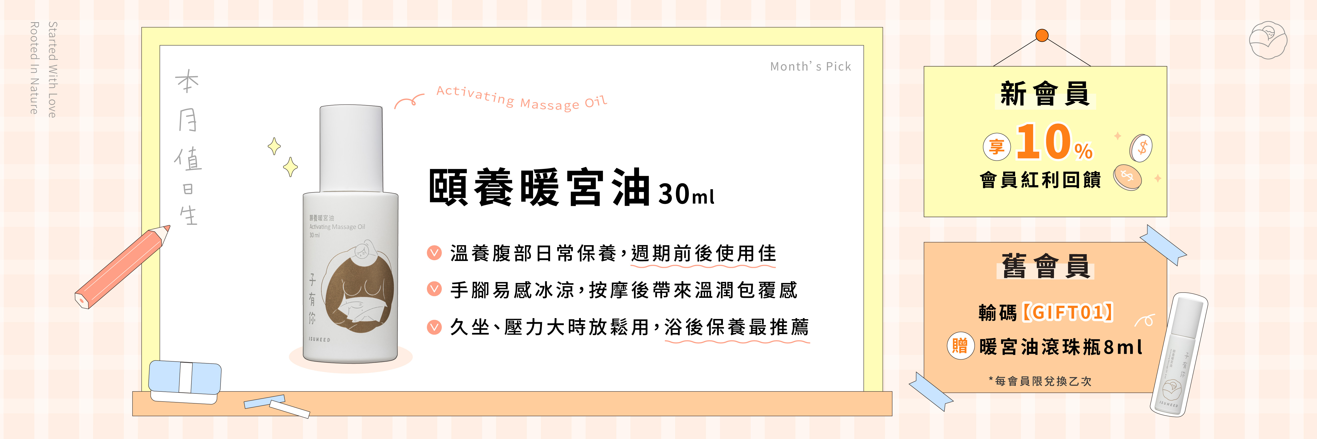 新會員:享 10% 會員紅利回饋 *  舊會員:輸碼【GIFT01】贈 頤養暖宮油 8ml 滾珠瓶 * 紅利回饋118點(即$118、可於下筆訂單全額折抵)待訂單完成後即會自動匯入會員帳戶,恕不另個...