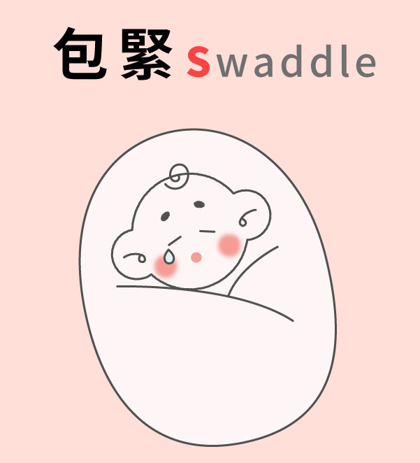 - 包緊 ( Swaddle):以包巾包住寶寶,模擬寶寶在子宮的狀態達到安撫作用