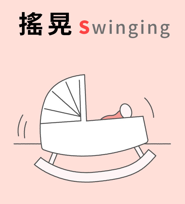 - 搖晃 (Swinging):輕輕搖晃寶寶是很有效的安撫方式,若寶寶躺在搖床上,須留意搖晃的頻率(慢速為佳),搖太快或太大力都會造成反效果