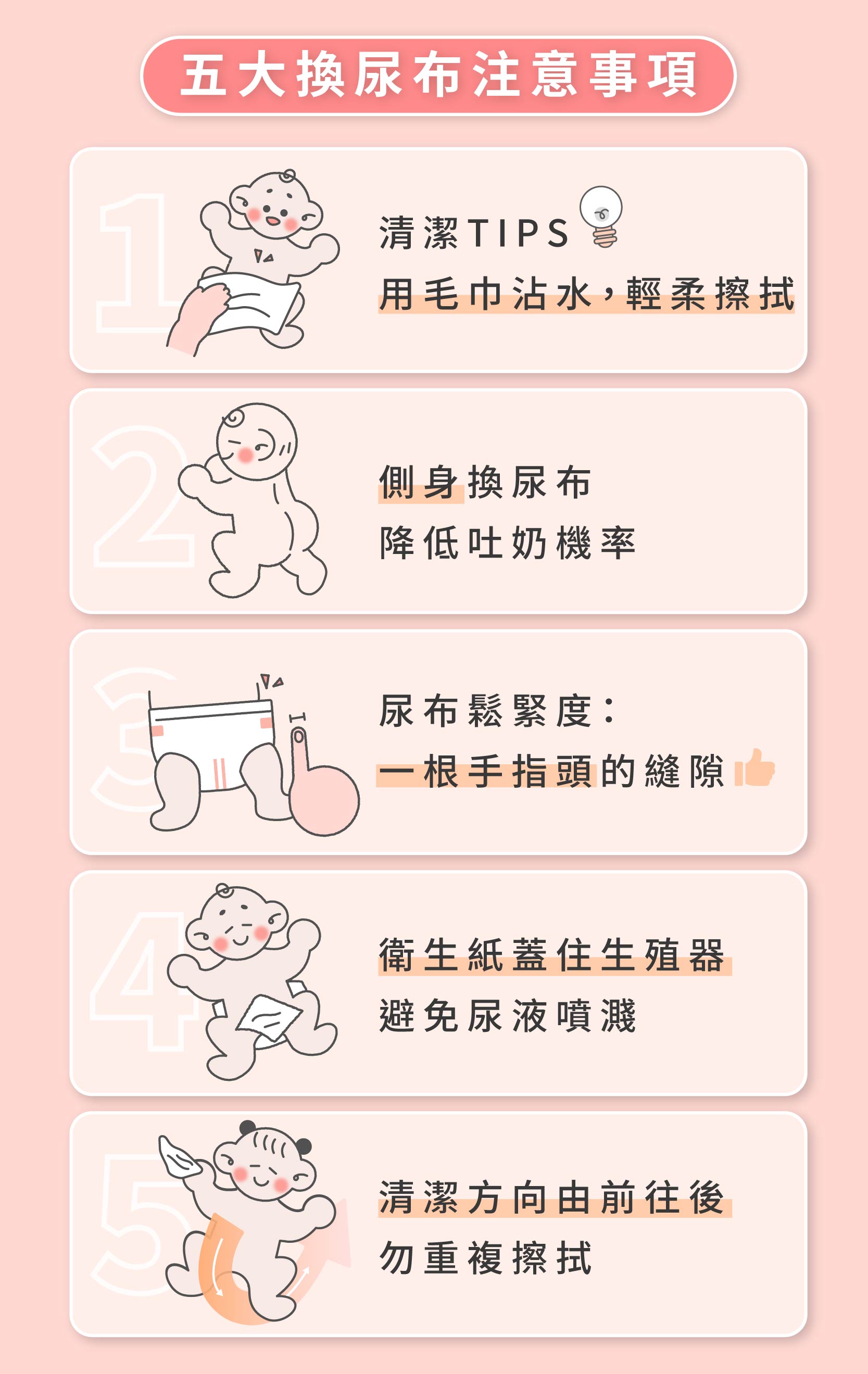 - 放尿布時讓寶寶側身,不要直接抬高雙腿(會傷到脊椎且容易吐奶)