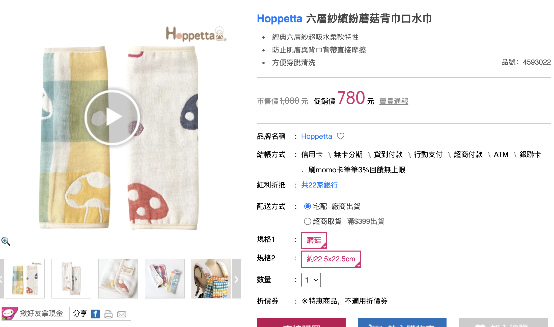 - 推薦商品:六層紗繽紛蘑菇背巾口水巾