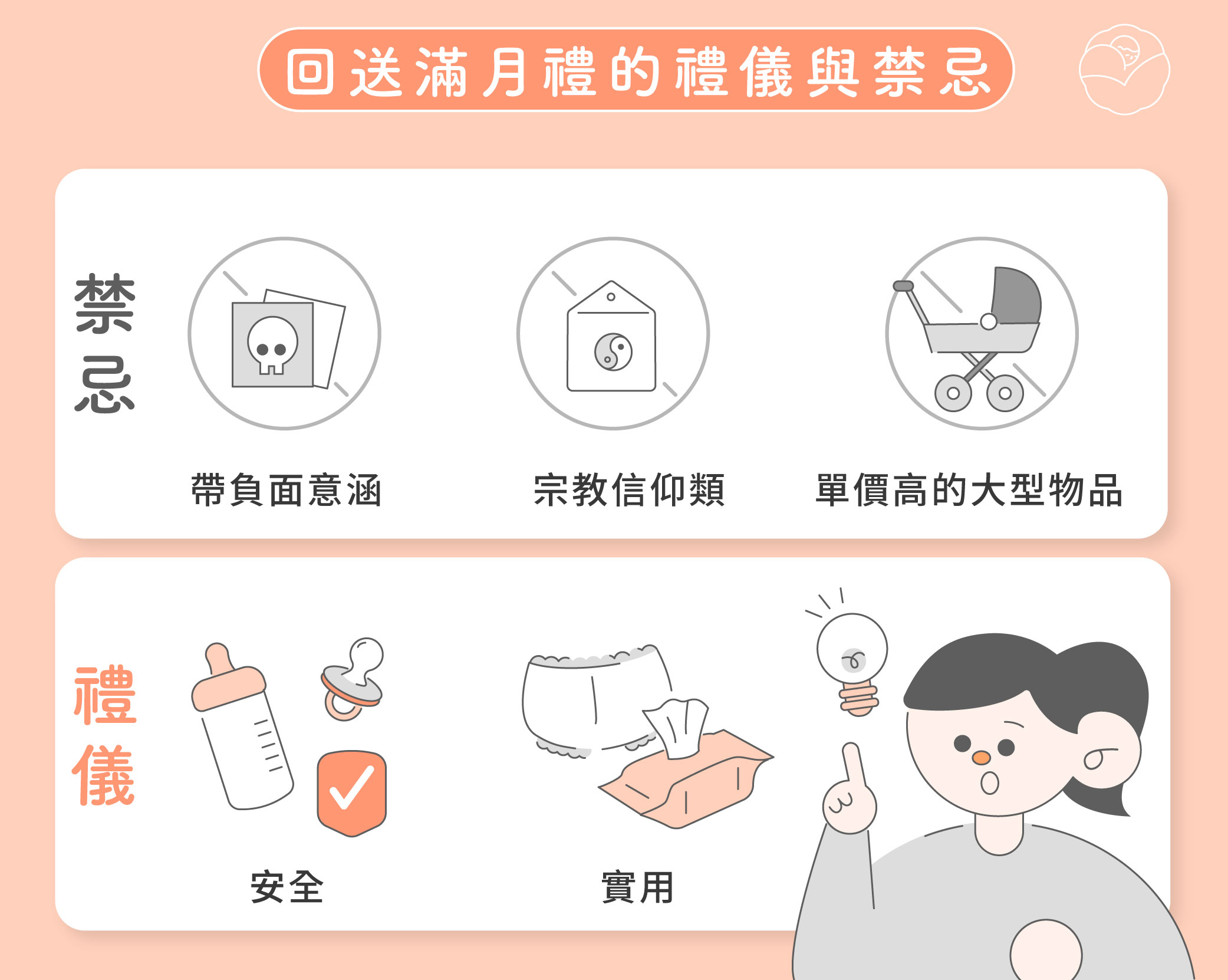 收到寶寶的滿月禮後,親友可依據交情、輩分、自身經濟等考量,挑選合適的禮物作為回贈及祝福。