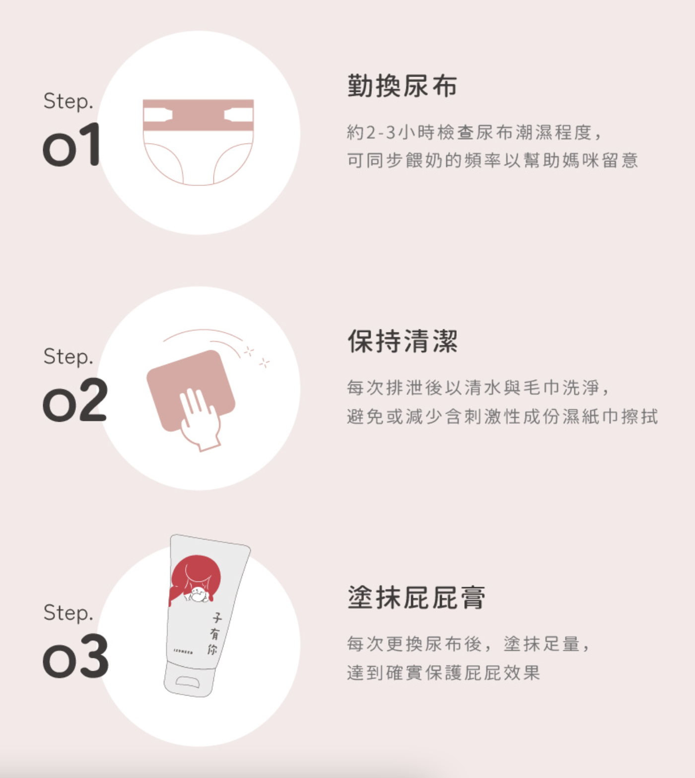 3.  保養 :輕薄塗抹一層屁屁膏至吸收,隔絕大小便、尿布摩擦刺激。